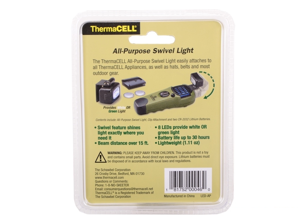 Фонарь универсальный ThermaCELL Swivel Light с поворотным механизмом, на клипсе прост и удобен в обращении. Устройство имеет 9 ярких светодиодов, которые обеспечивают белое или зеленое свечение в зависимости от выбранного пользователем режима. Длина светового луча достигает 38 см. При помощи эргономичной клипсы фонарь можно закрепить на любое устройство или кепку. Идеален для туристических походов, рыбалки, охоты и других видов активного отдыха.