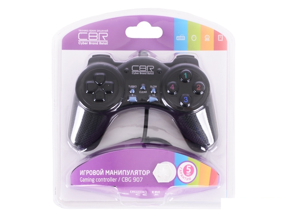 Геймпад CBR CBG 907 для PC – простое проводное устройство, которое синхронизируется с консолью PC. Высокая точность действий во время игры достигается за счет продуманной эргономики геймпада. Все 14 элементов управления чутко реагируют на касания и очень удобны для рук любого пользователя. Радиус действия одного геймпада достигает 15 м, поэтому вы можете расположиться за игрой, так как вам будет комфортнее, несмотря на то, что перед нами проводное устройство. CBR CBG 907 можно использовать не только для PC, но для ПК.