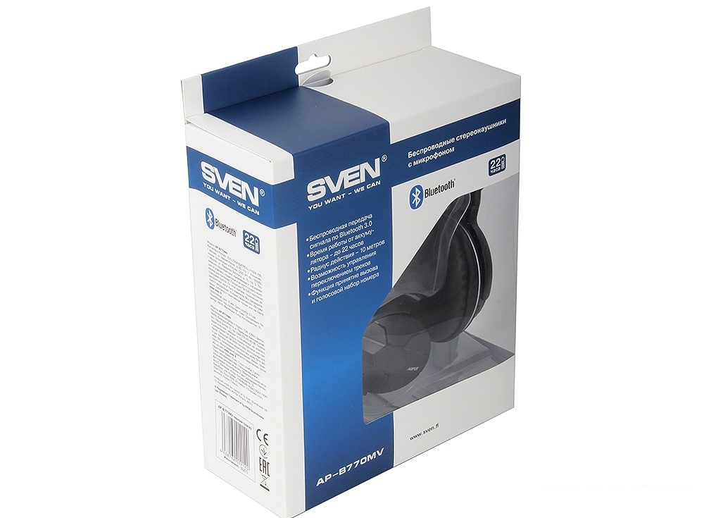 Беспроводная стерео-гарнитура SVEN AP-B770MV обеспечивает взаимосвязь с звуковоспроизводящими устройствами с Bluetooth интерфейсом. Модель снабжена амбушюрами из мягкого материала, которые плотно прилегают к ушным раковинам и исключают влияние шумов и посторонних звуков. Кроме того конструкция гарнитуры и чашек позволяет довольно длительный период использовать их по назначению и не ощущать дискомфорт. SVEN AP-B770MV можно применять в качестве наушников для прослушивания музыки, аудио материалов к фильмам и т.д., или как гарнитуру для приема звонков и разговоров по телефону либо Skype. Наушники обладают отличным дизайном и выполнены в популярном молодежном стиле. Регулируемое оголовье позволит настроить необходимую длину под каждого конкретного пользователя. Вместе с тем качество воспроизводимого звука в первую очередь обеспечивается отличным частотным диапазоном 20 – 22 000 Гц. Чувствительность наушников составляет 106 Дб, что обеспечивает довольно высокую громкость при слабых сигналах на входе. Гарнитура оснащена подвижными чашками наушников, позволяющими компактно слаживать весь аппарат для удобной переноски в сумке либо чемодане.