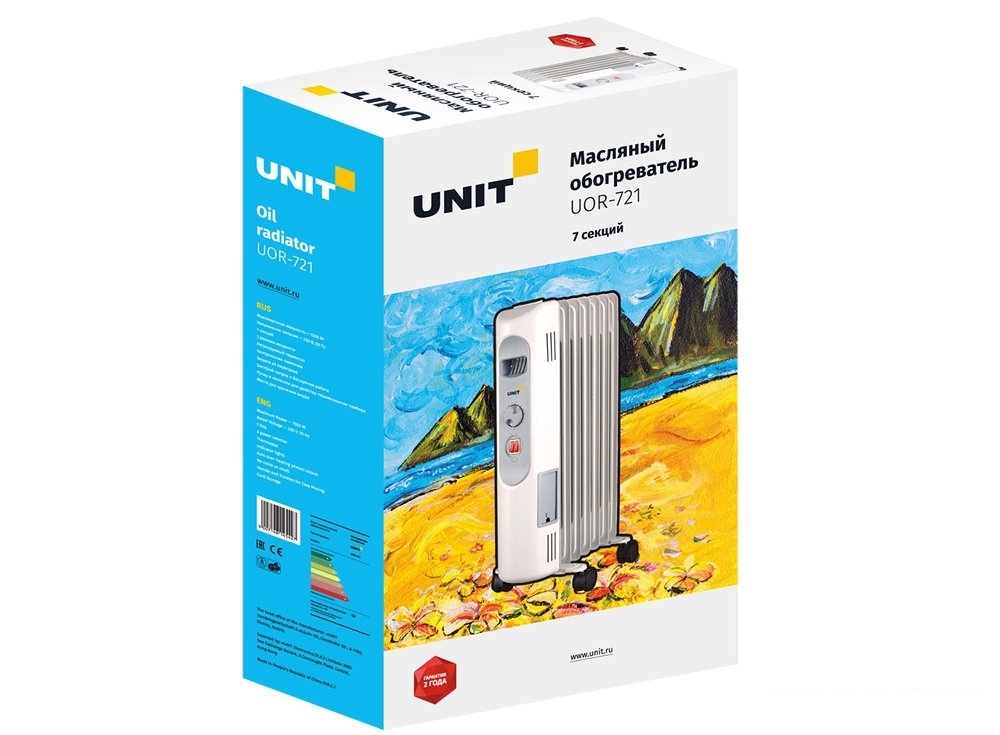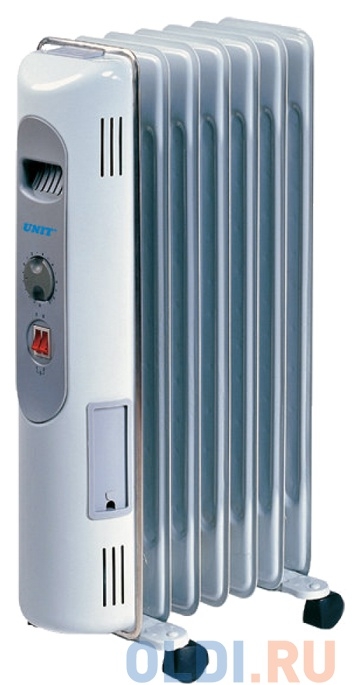 Нагреватель масляный Unit UOR-721 – является современным и стильным электроприбором, который позволяет быстро нагреть не очень большое помещение. Он обладает максимальной мощностью нагрева 1500 Вт, и тремя ступенями регулировки производительности, что позволяет включать нужный режим в зависимости от температуры. Источником тепла в радиаторе является минеральное масло, которое нагревается в специальном, безопасном внутреннем контейнере. Такой способ нагрева не подсушивает воздух, и не сживает пыль. Обогреватель UOR-721 имеет семь секций, механические управление термостатом в виде поворотных переключателей, а также индикаторные лампочки включенного режима. Регулируемый термостат подстраивают под необходимую температуру нагрева, которая будет автоматически поддерживаться в зависимости от степени нагрева помещения.